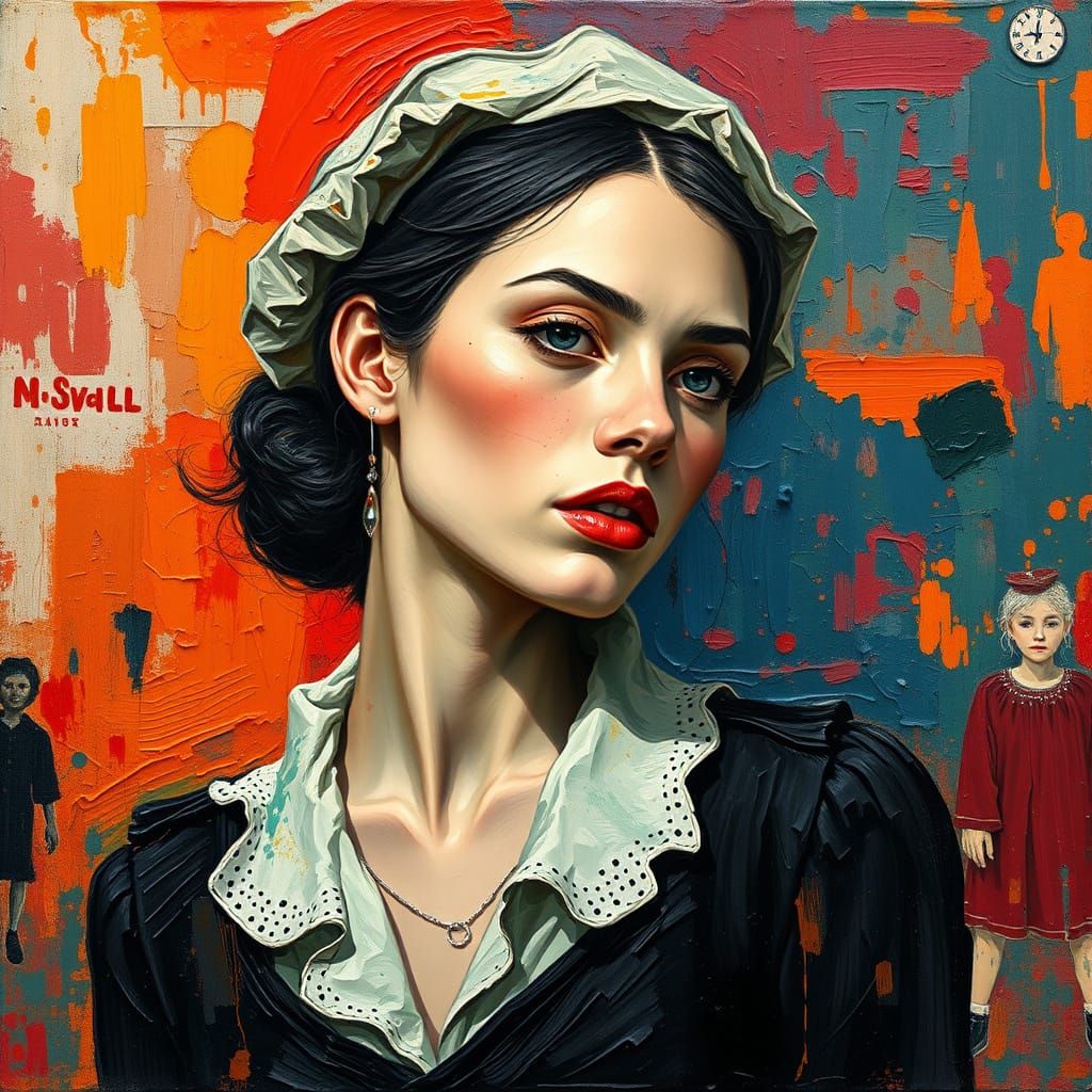 A striking portrait of a young woman adorned with vibrant, textured paint layers. The artwork features bold brushstrokes and an intense, emotive expressionist style with a smooth impasto finish.