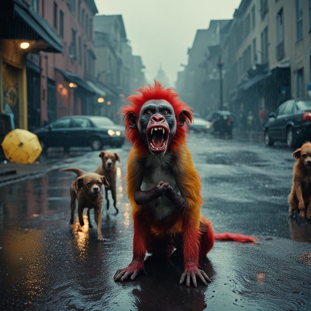 A dramatic image of zombie monkey monster clown infants playing in a rainy street as dogs attack, captured with cinematic lighting and film grain. This live-action scene features a moody, atmospheric aesthetic.