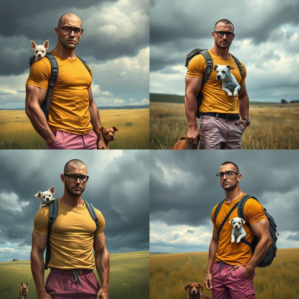 This image shows a sad, muscular man with a shaved head and glasses standing in a meadow with two dogs, one in a backpack. It's a detailed matte painting with deep colors and fantasy art elements.