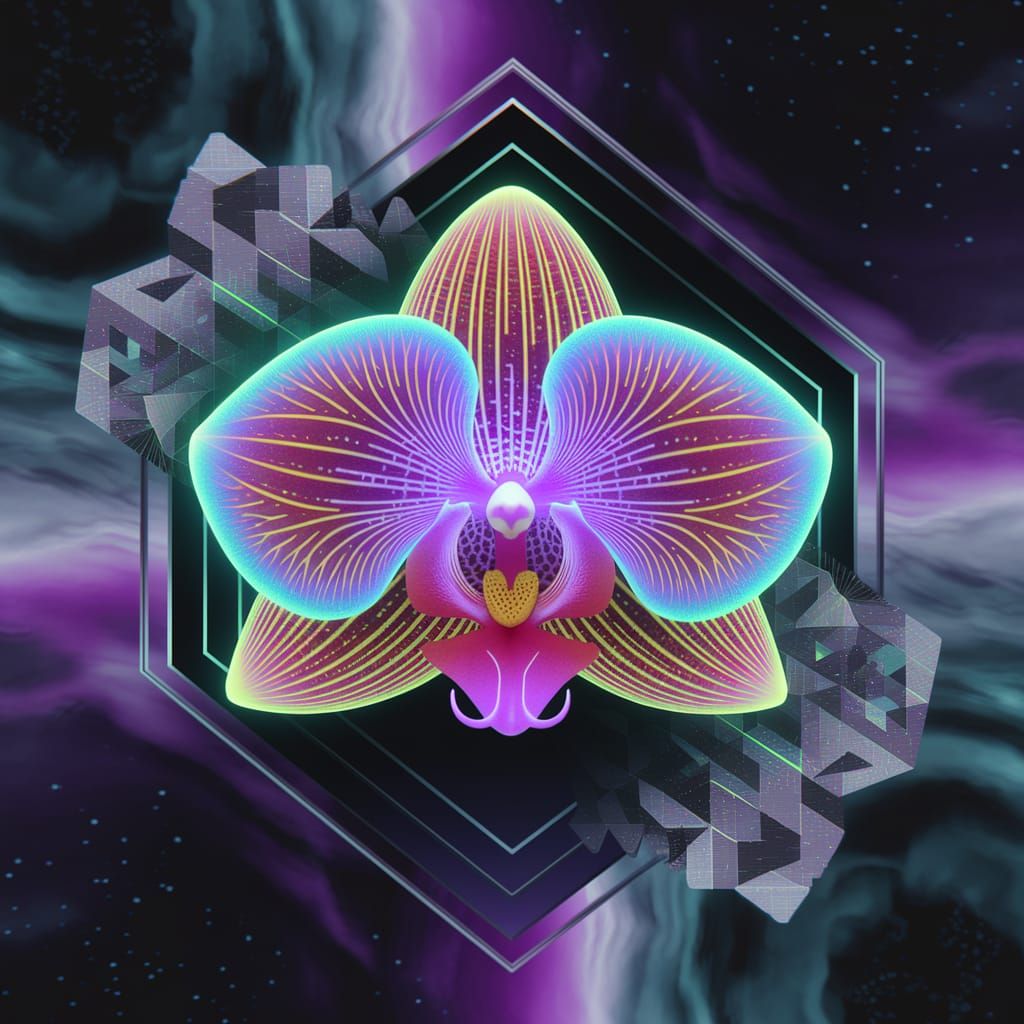 This image shows a giant, glowing orchid in space. The flower's petals have neon pink, purple, and cyan lights with swirling patterns and cyberpunk geometric holograms, set against nebula clouds.