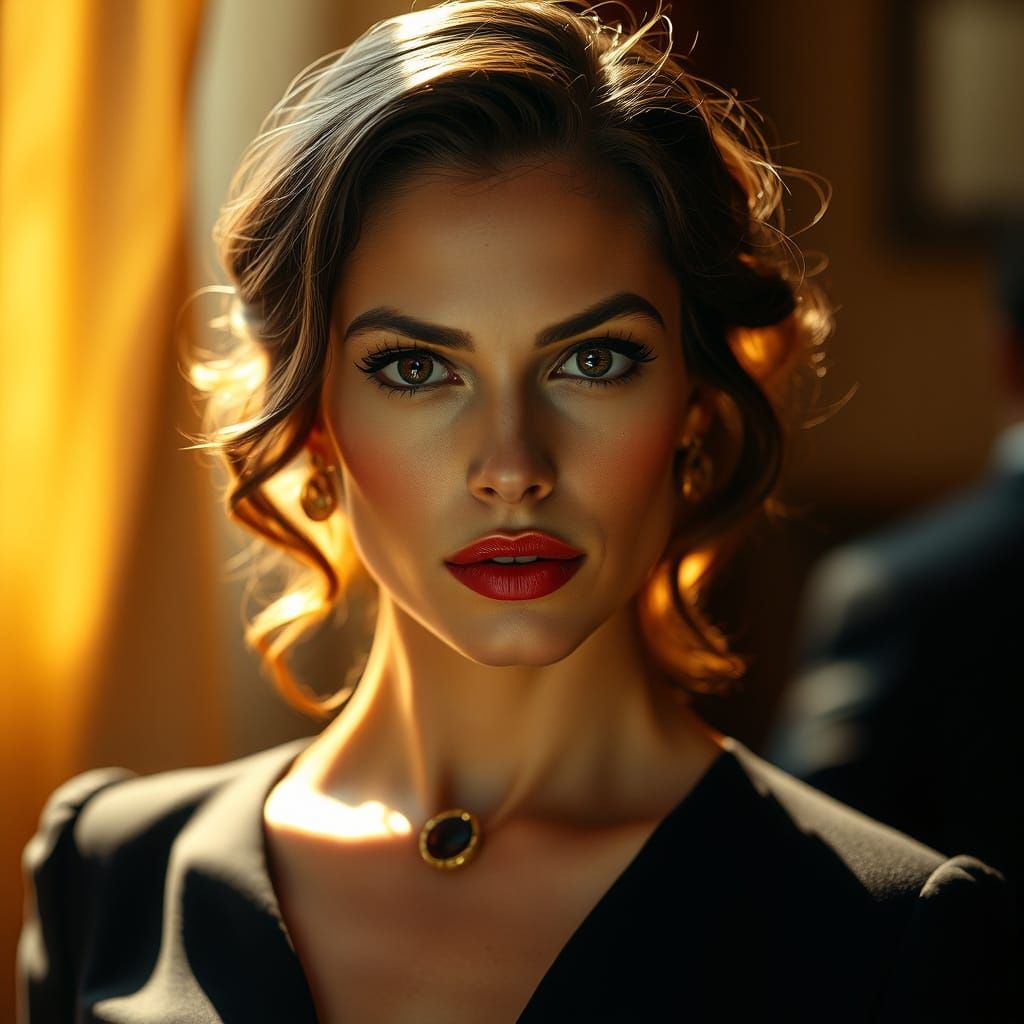 This portrait features a woman with expressive eyes and luscious lips, dressed in a fitted outfit, gazing directly at the viewer with confidence and allure, illuminated by warm golden light in a style reminiscent of 19th-century portraiture and cinematic photography.