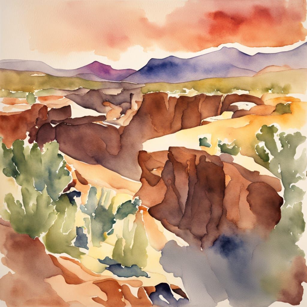 A vibrant watercolor painting of a mesa landscape. The artwork captures the essence of desert scenery with a fluid color palette and flowing lines.