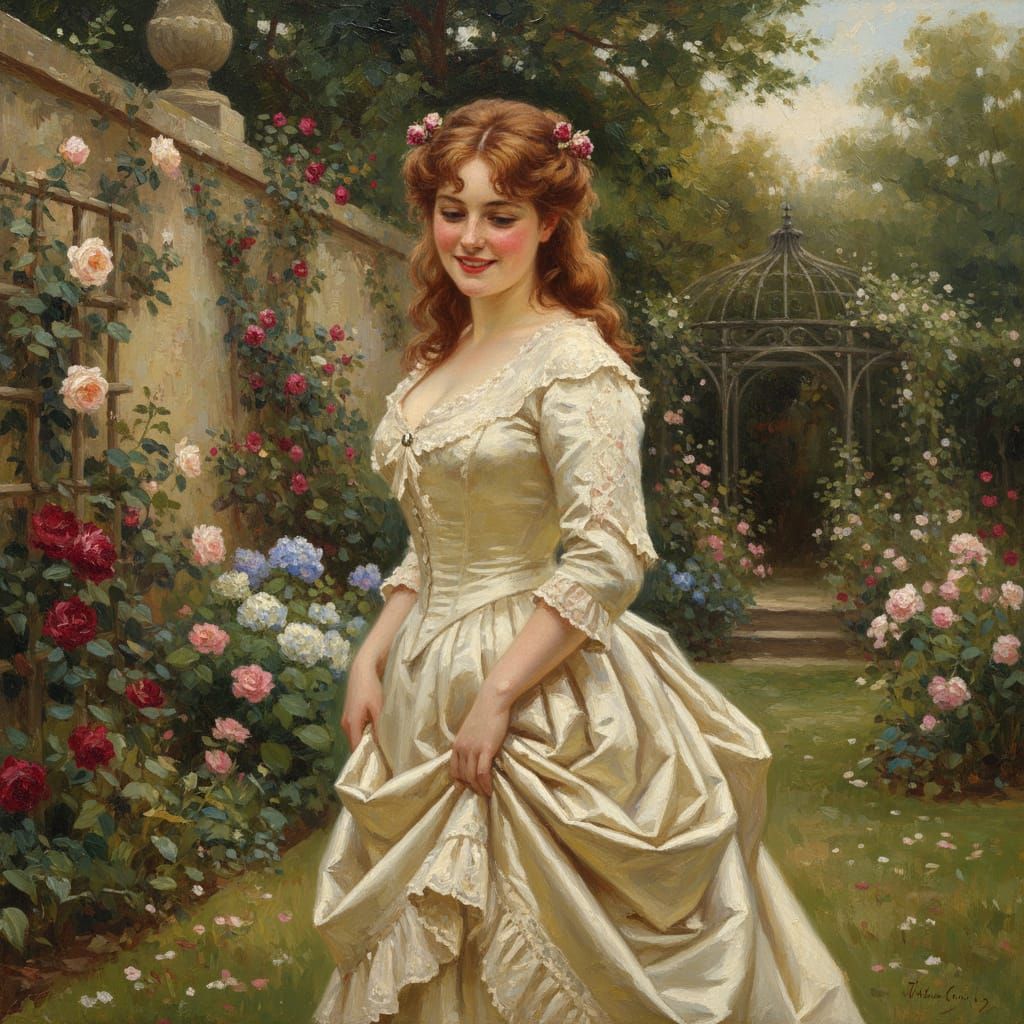 This oil on canvas painting depicts a beautiful, curvy young Victorian woman with auburn hair and freckles. She has a shy smile and is set in a garden scene.