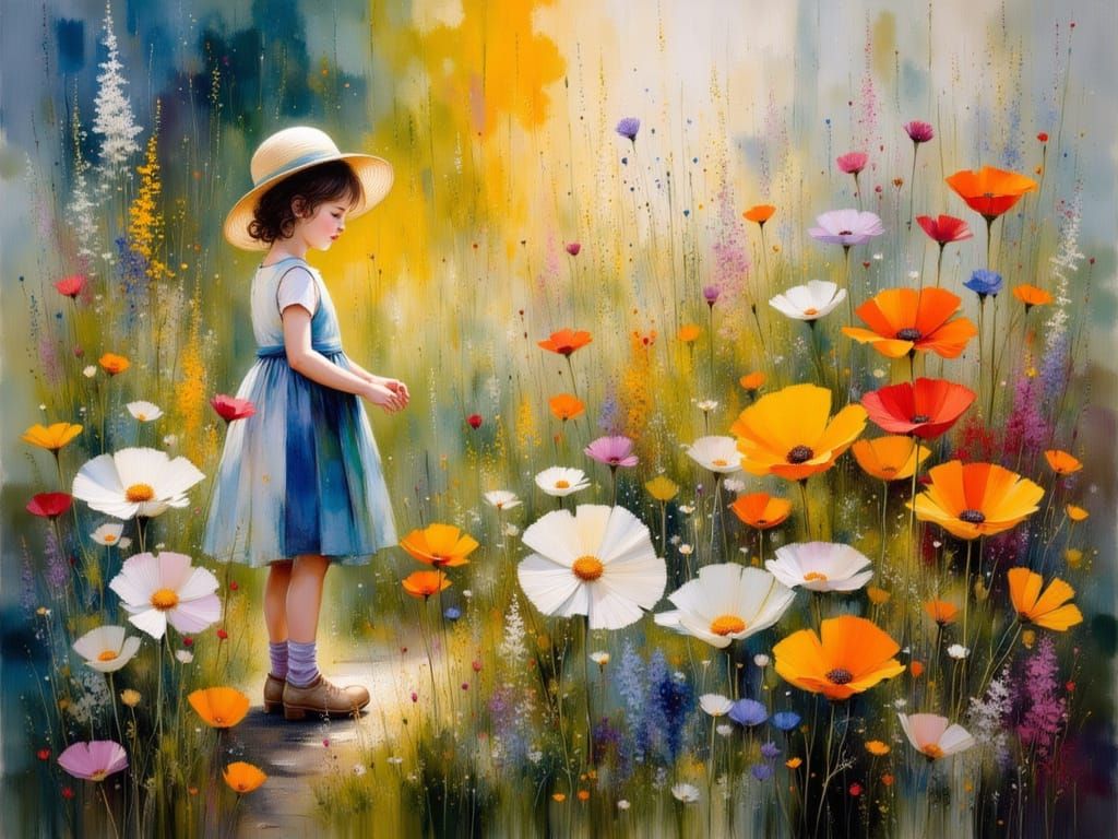 This enchanting image depicts a young girl amidst a lush, blooming meadow, teeming with life and color, evoking a sense of mystery and wonder in a dreamlike world.