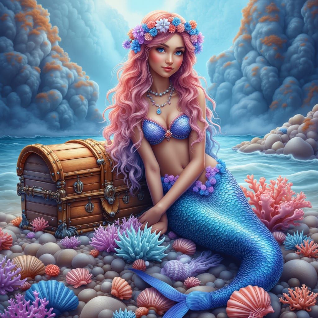 @MiDIGITaiLs thank you for the prompt!! A young Mermaid sitting on rocks by a treasure chest on the beach surrounded by colourful seashells, Glowing pearl necklaces. Iridescent shimmering scales. Soft ocean mist, intricate patterns. Soft, ethereal lighting. Fanciful details. Soft, golden lighting. Dreamy, celestial, mystical, cosmic, heavenly, ethereal. Masterpiece, high quality, watercolor art style blended with Pop surrealism, sharp focus, realistic, intricate details, stunning, ornate, majestic, crystal clarity, muted tones and pastel colours, and subtle textures
