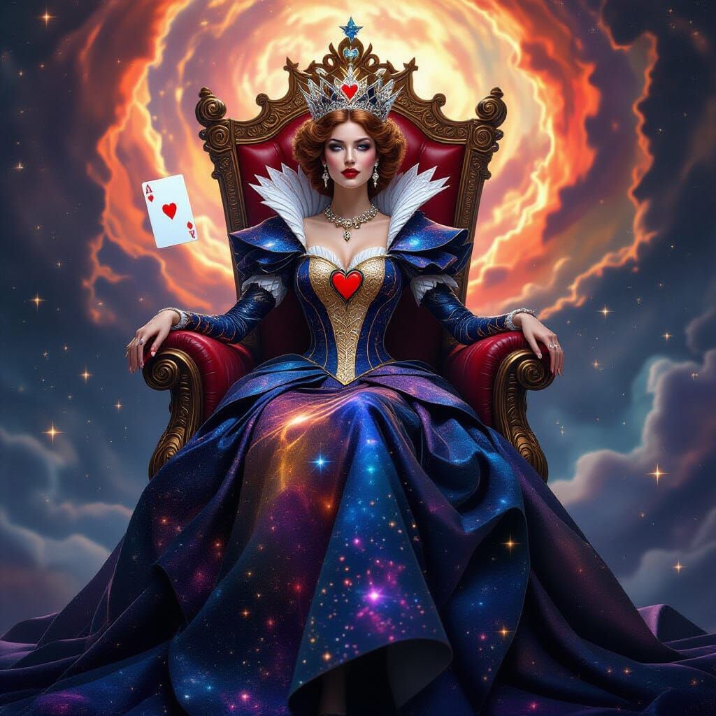 A regal empress, embodying the Queen of Hearts, seated on a throne of stardust. Her gown reflects galactic colors, with a constellation crown. Cosmic energy swirls in the background. This artwork blends classical portraiture with epic space opera.