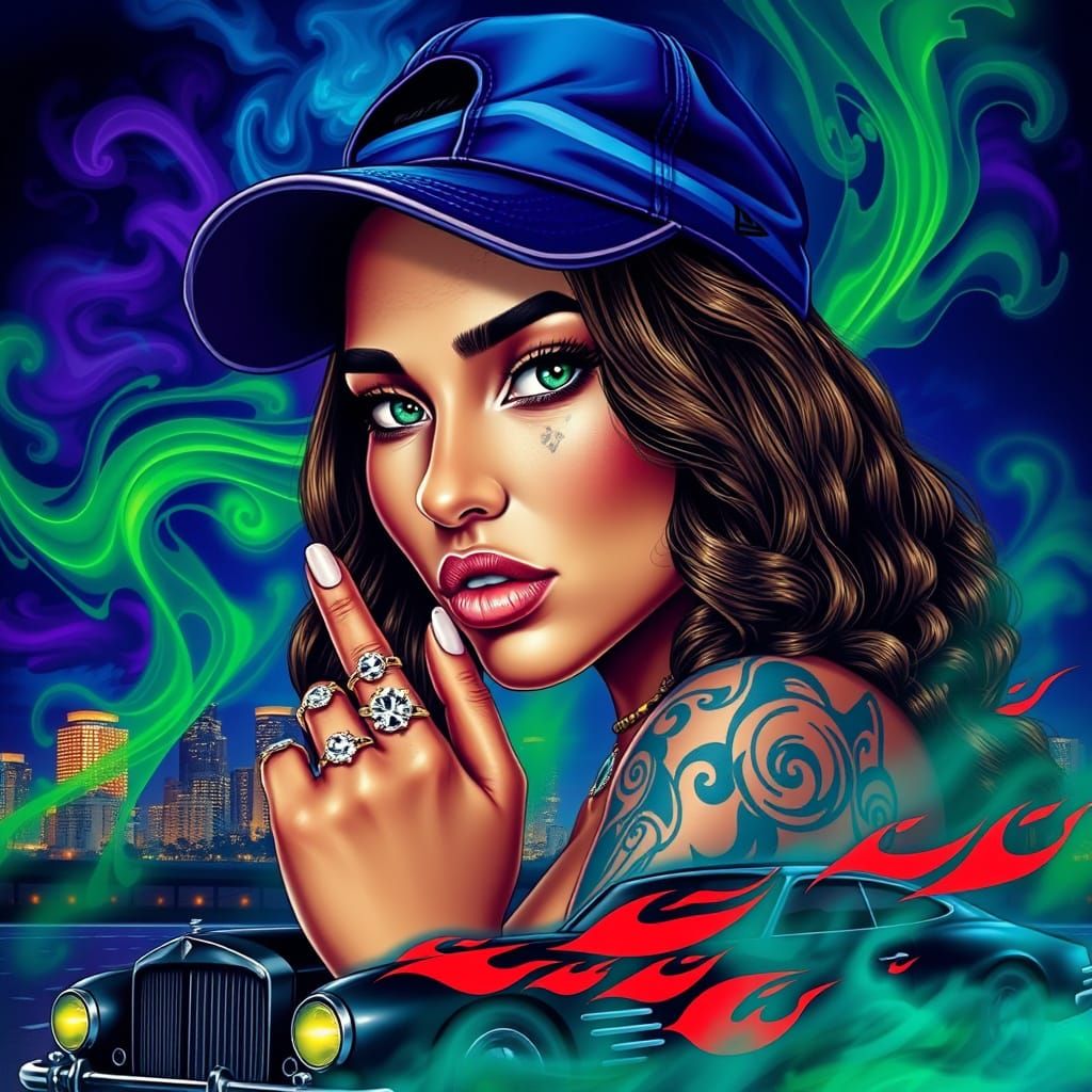 This image shows a portrait of a Maori woman with spiral chin tattoos and bright green eyes. The subject is wearing a baseball cap and summer top, revealing arm tattoos, against a backdrop of swirling smoke and a futuristic cityscape.