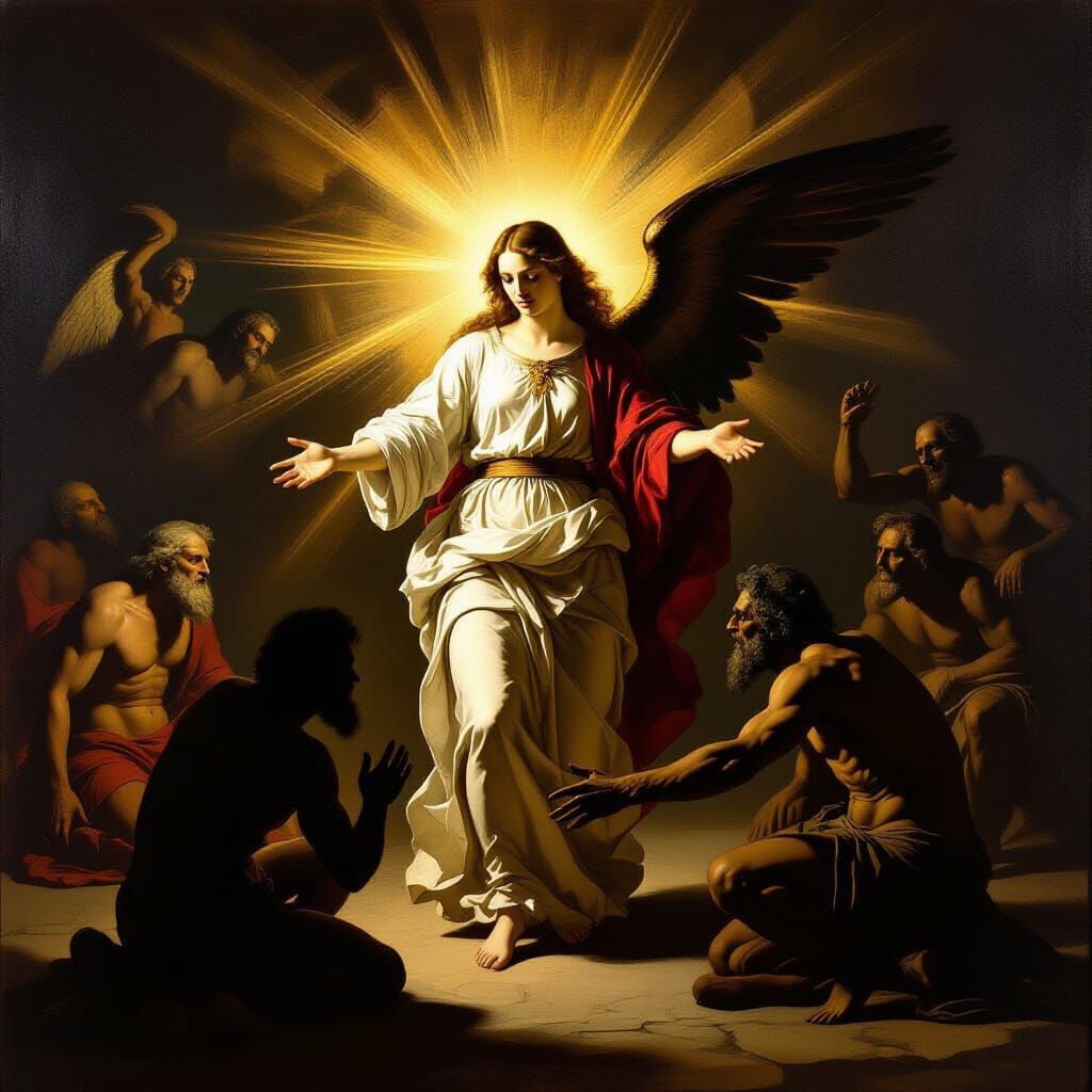 A dramatic oil painting in the style of Caravaggio, showing divine light from Christianity confronting shadowy, fading myths. Features strong chiaroscuro and contrasting colors.