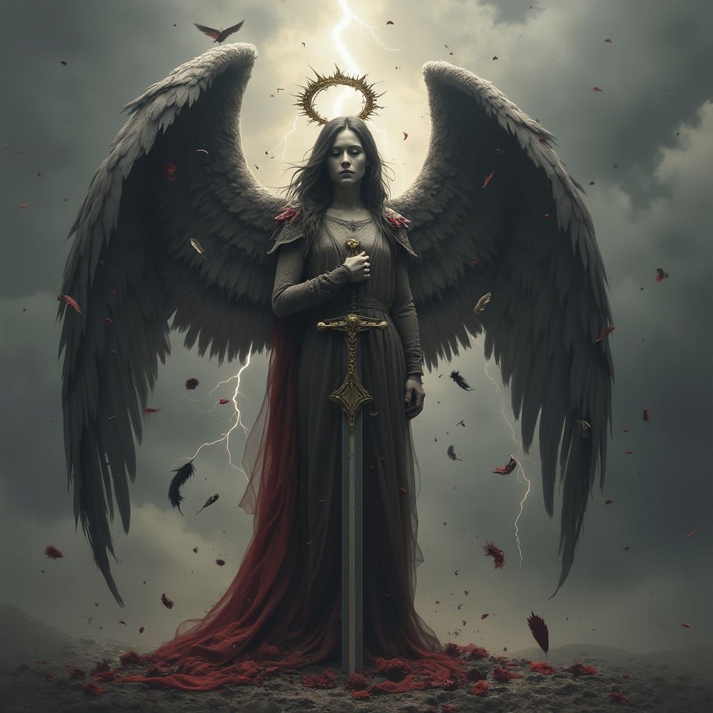 A grayscale image of a fallen angel with broken wings, depicted in a detailed matte painting style. The figure stands amidst dark clouds, with scattered feathers and a cracked sword.
