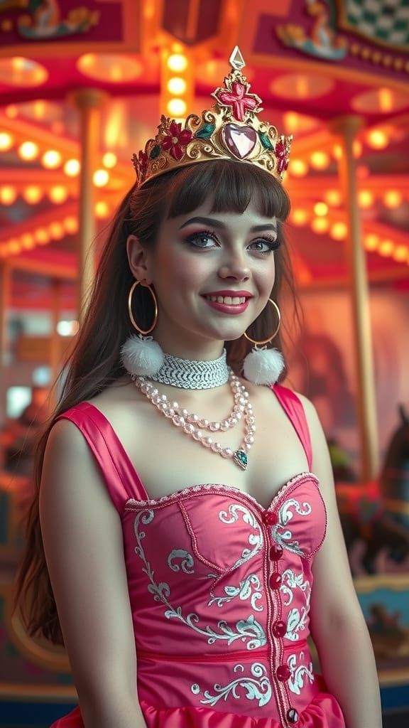 This image shows a detailed ring girl in a Catholic punk aesthetic, set against a softly lit carousel. Rendered with intricate textures and a blush color palette.