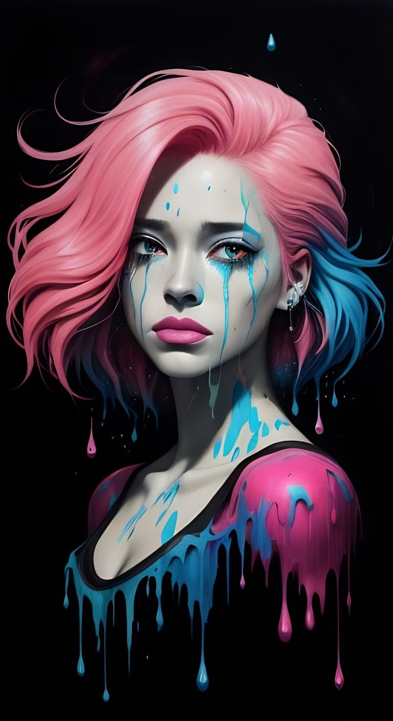 This striking image depicts a beautiful young woman with vibrant pink hair, plummeting into the depths of a mysterious abyss. Created in a dynamic, high-contrast style, blending elements of graffiti and splash art, this piece showcases ultra-detailed, colorful, and polychromatic visuals.