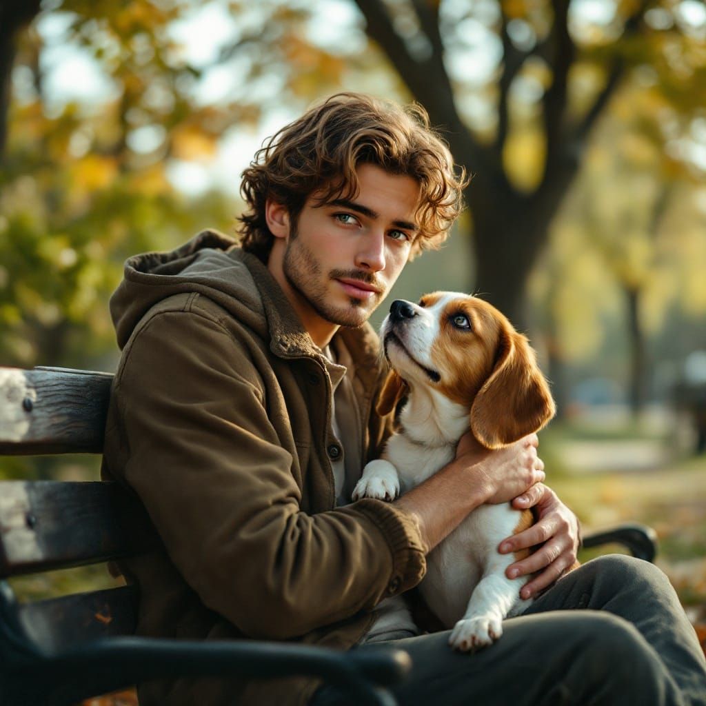 This image captures a heartwarming moment of a young man bonding with his loyal beagle in a serene city park setting, bathed in soft natural light and vibrant colors, reminiscent of hyper-realistic digital art with meticulous textures and details.