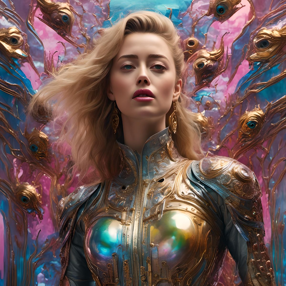 A vibrant, photorealistic portrait reminiscent of Pino Daeni's style. The artwork showcases iridescent details, creating a fantastical and beautiful depiction in a Lora Murraypunk aesthetic.