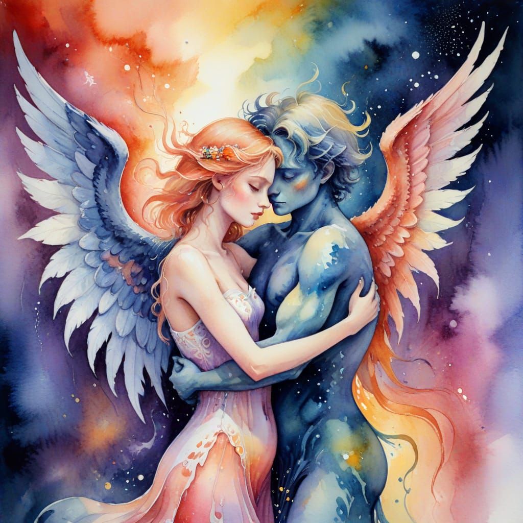 This image depicts a surreal and whimsical watercolor painting of an angel and a demon sharing a gentle embrace. It features delicate brushstrokes and vibrant cosmic colors.
