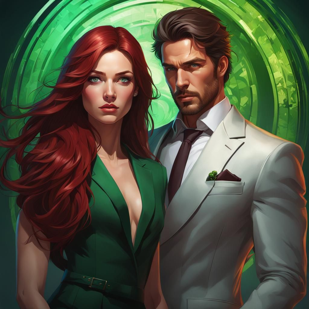 This striking portrait features a captivating woman with vibrant red hair and green eyes beside a sharply dressed man. Rendered with intricate detail and dynamic lighting, it evokes a classic, high-resolution aesthetic.