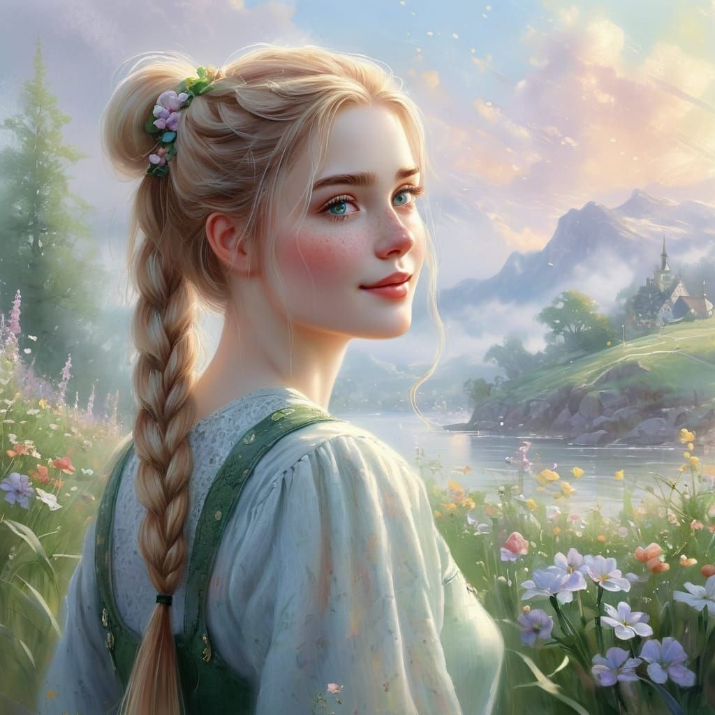 This image shows a pretty woman with freckles, long blonde hair in a braid, and sparkling green-blue eyes. Rendered in a realistic sketch style with watercolor and pencil details.