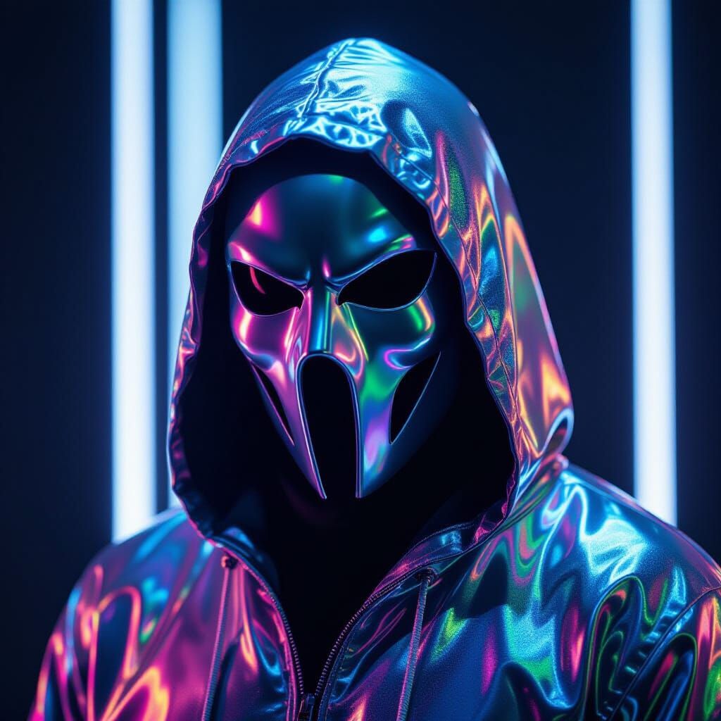 A striking picture of a futuristic Ghostface portrait. The iconic mask is rendered in shimmering holographic liquid metal, reflecting a rainbow of colors against a stark black backdrop.