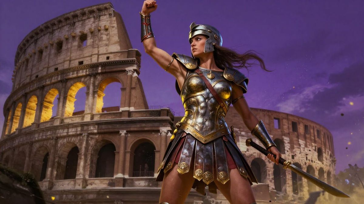This image showcases a triumphant female gladiator in Rome's Colosseum, rendered in a dark fantasy concept art style with dramatic lighting and deep colors.