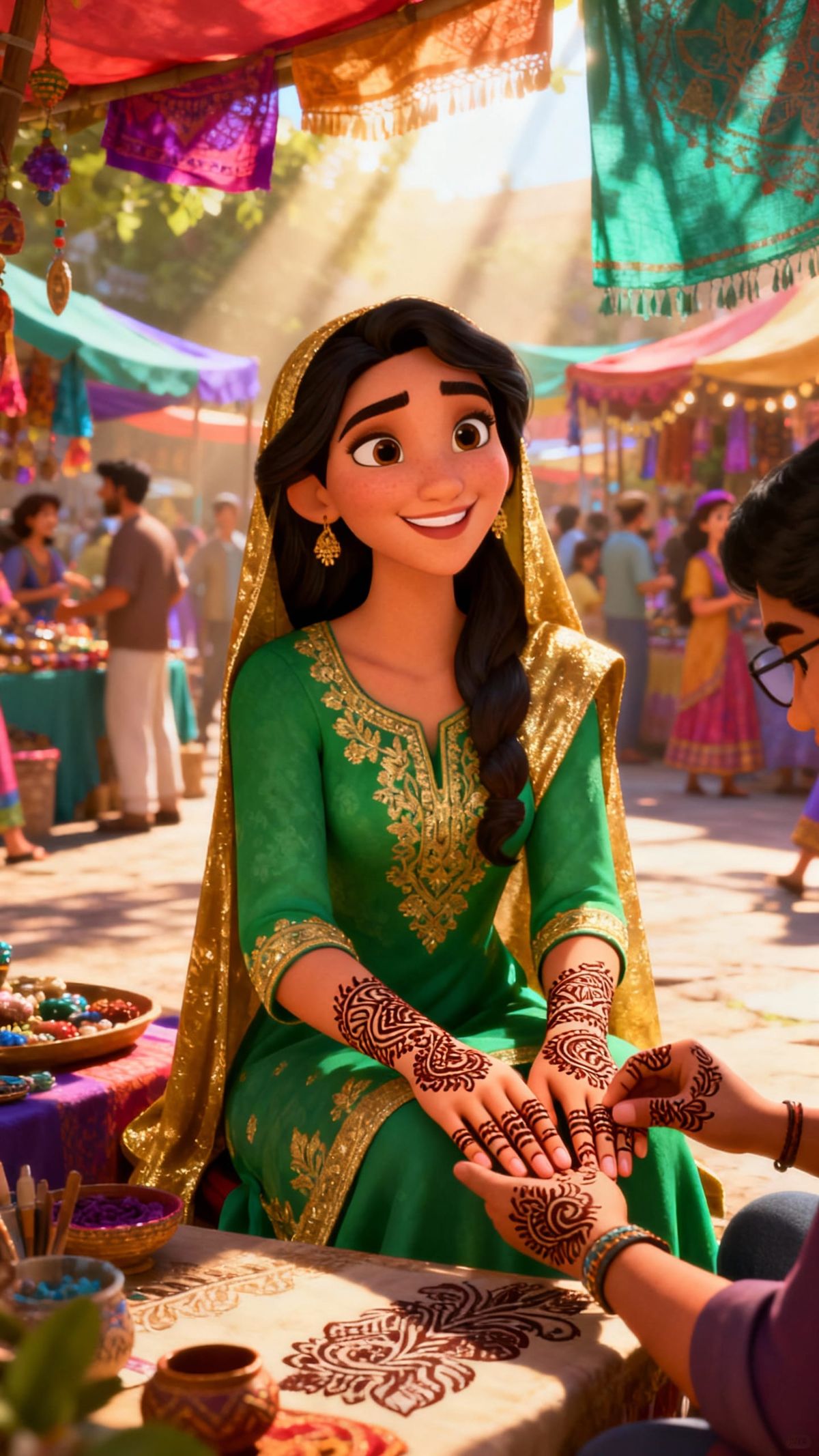A vibrant 3D cartoon image of a woman in a green dress at a mehndi stall. Sunlight highlights the bustling market and intricate henna designs, creating a festive atmosphere.