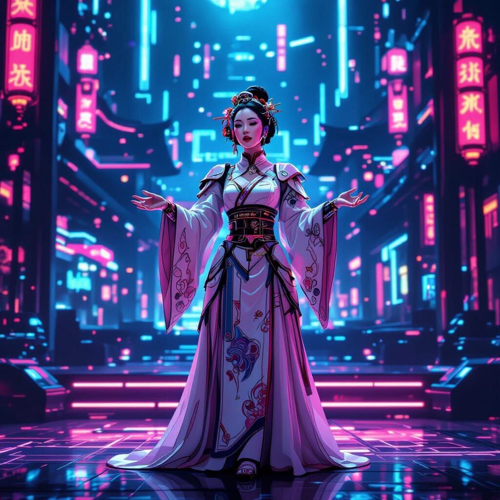 An android in traditional Chinese opera costume performs on a vibrant, neon-lit cyberpunk stage, featuring futuristic architecture and dynamic character design.