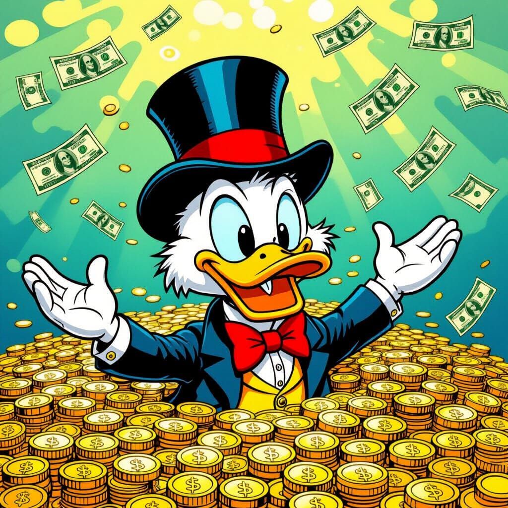 A vibrant, cartoon-style image of Scrooge McDuck in his money bin. The scene is rendered with bold lines and bright colors, capturing a whimsical and satirical aesthetic.