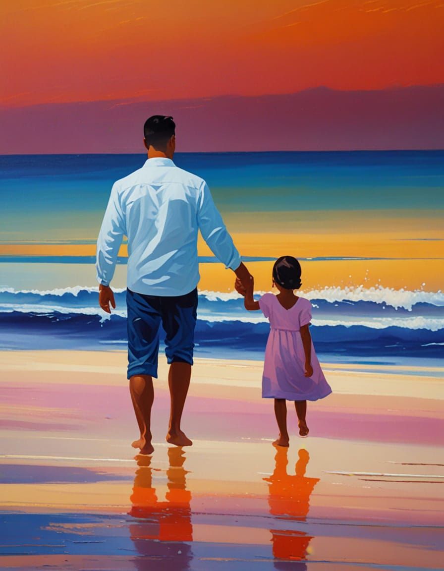 A vibrant neo-impressionist oil painting of a family walking on a beach at sunset. The expressionist artwork features thick textured paint, warm golden lighting, and a summer atmosphere in an art-deco style.