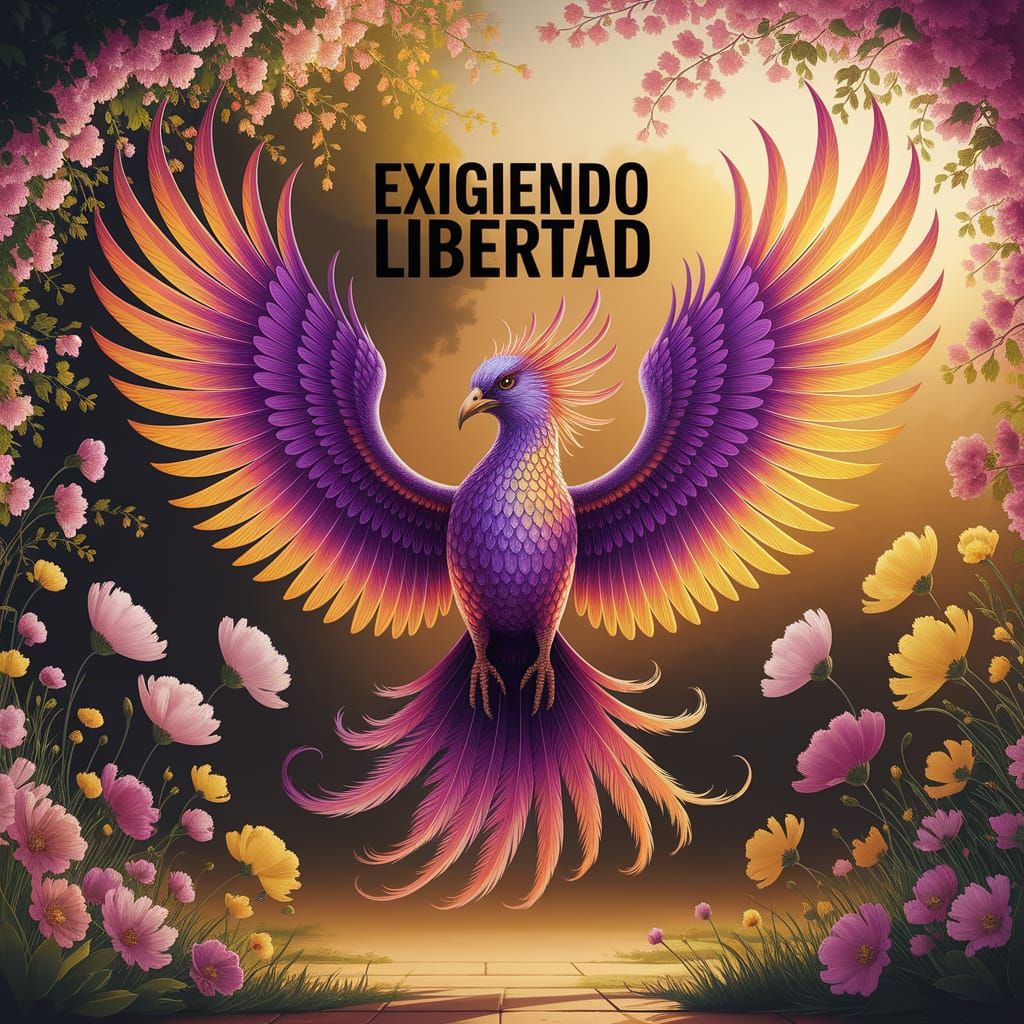 This image shows a majestic purple and orange phoenix in a serene garden setting, surrounded by delicate flowers and bathed in warm, golden light.
