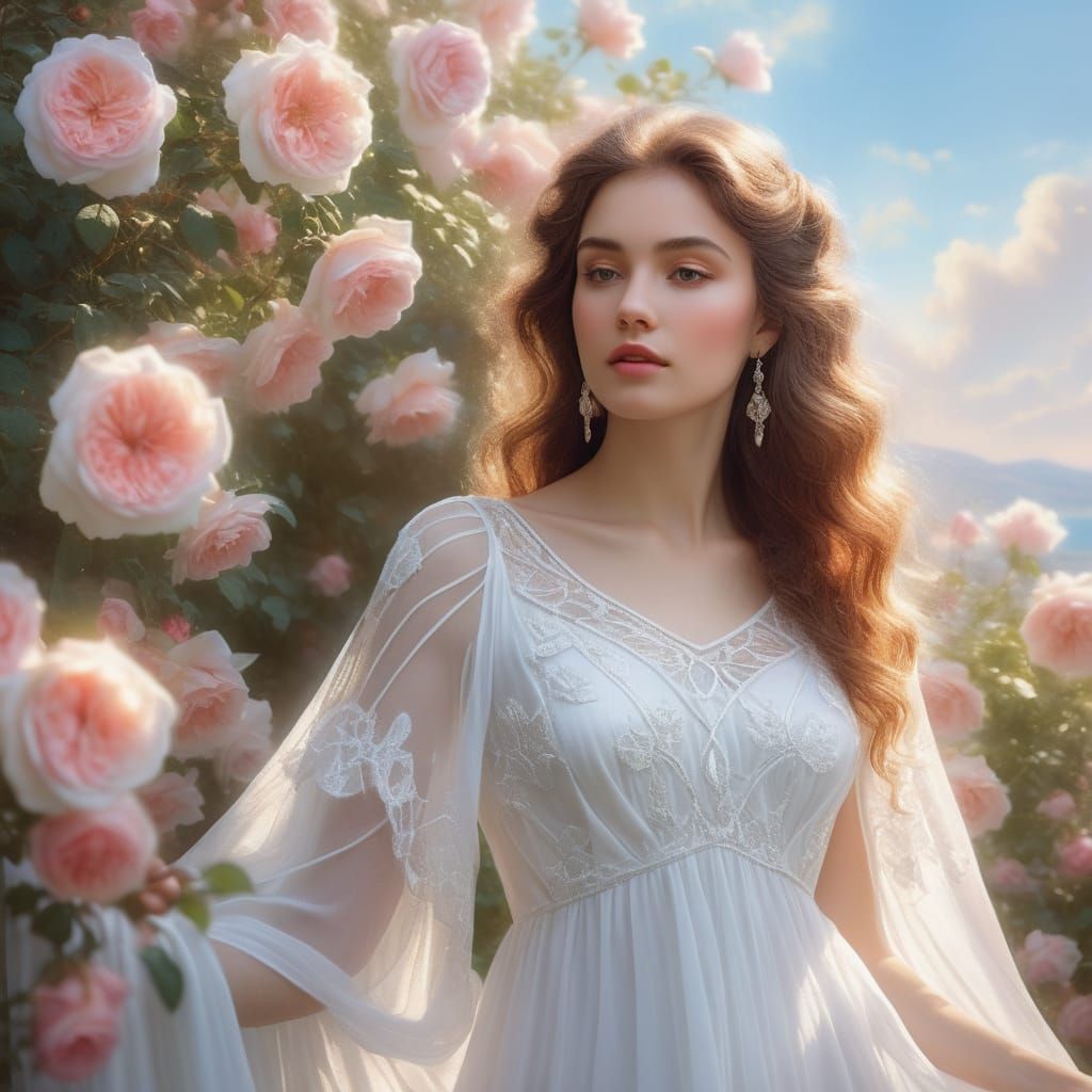 This image shows a beautiful young woman in a serene summer landscape, surrounded by blooming roses in a soft focus, with a gentle play of light and shadow, and a sparkling, ultra-detailed, hyper-realistic style reminiscent of Thomas Kinkade's aesthetic