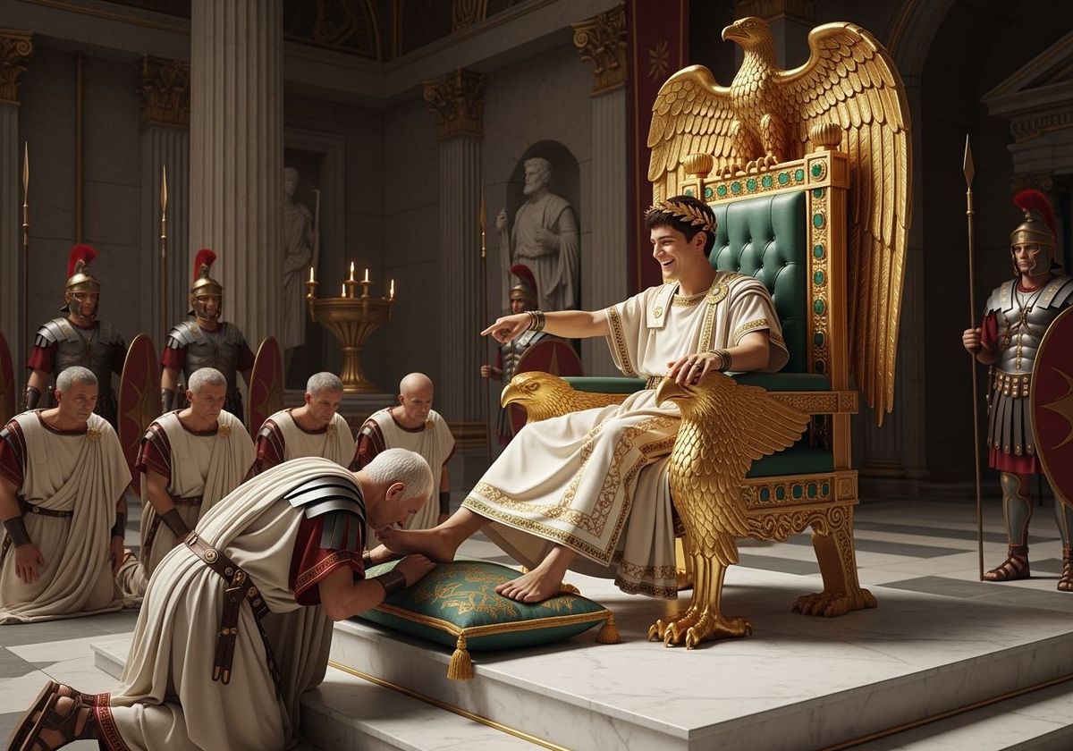 This image depicts Emperor Nero seated on a throne of gold and emeralds, receiving homage from kneeling senators. Roman Legionnaires stand guard as the Emperor gestures with a pointed finger.