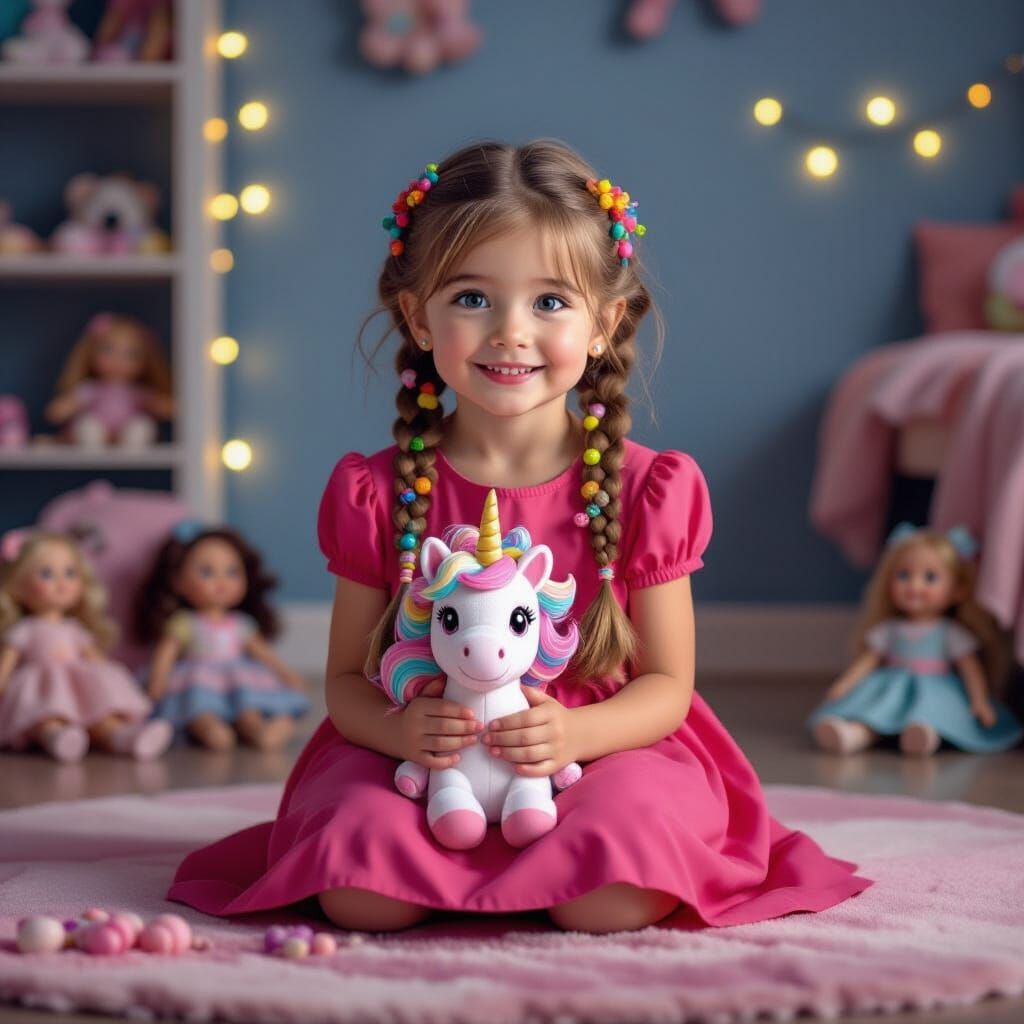 This image shows a young girl kneeling on a rug in her playroom, holding a plush unicorn. Surrounded by toys and fairy lights, she has a wide-eyed expression. The scene is reminiscent of vibrant, dreamlike digital art.