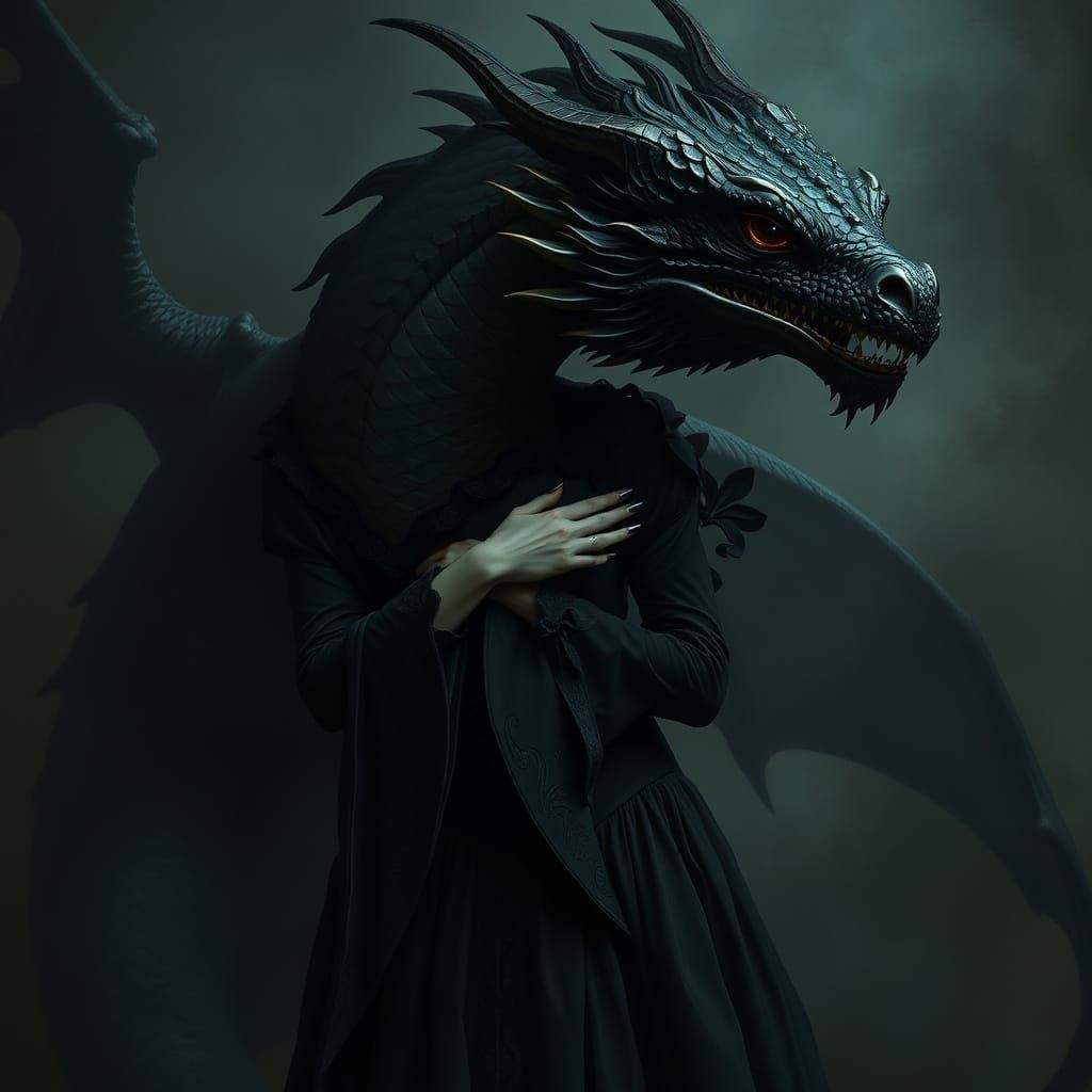 A digital painting of a gothic woman in Victorian dress embracing a large dragon. The artwork blends dark fantasy with mystical realism.