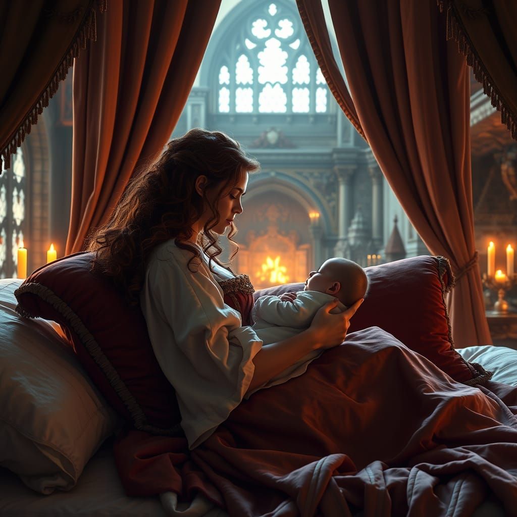 A serene medieval woman cradles her newborn baby in a grand, candlelit bedchamber within a majestic castle, surrounded by warm golden light and intricate textures.