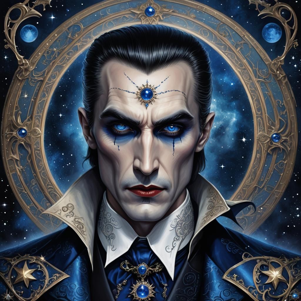 A striking picture of Count Dracula featuring sapphire-blue eyes and bold makeup. His back features a celestial moon tattoo. The image is a detailed matte painting rendered in 8k resolution.