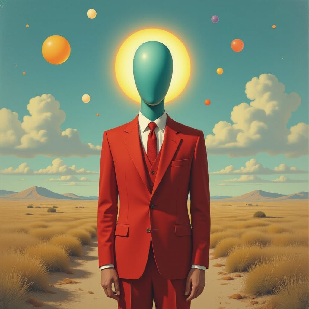 This image depicts a man in a red suit with a missing head, standing in a surreal, abstract landscape. The scene features vibrant colors and dreamlike glows, inspired by surrealist art and photography.