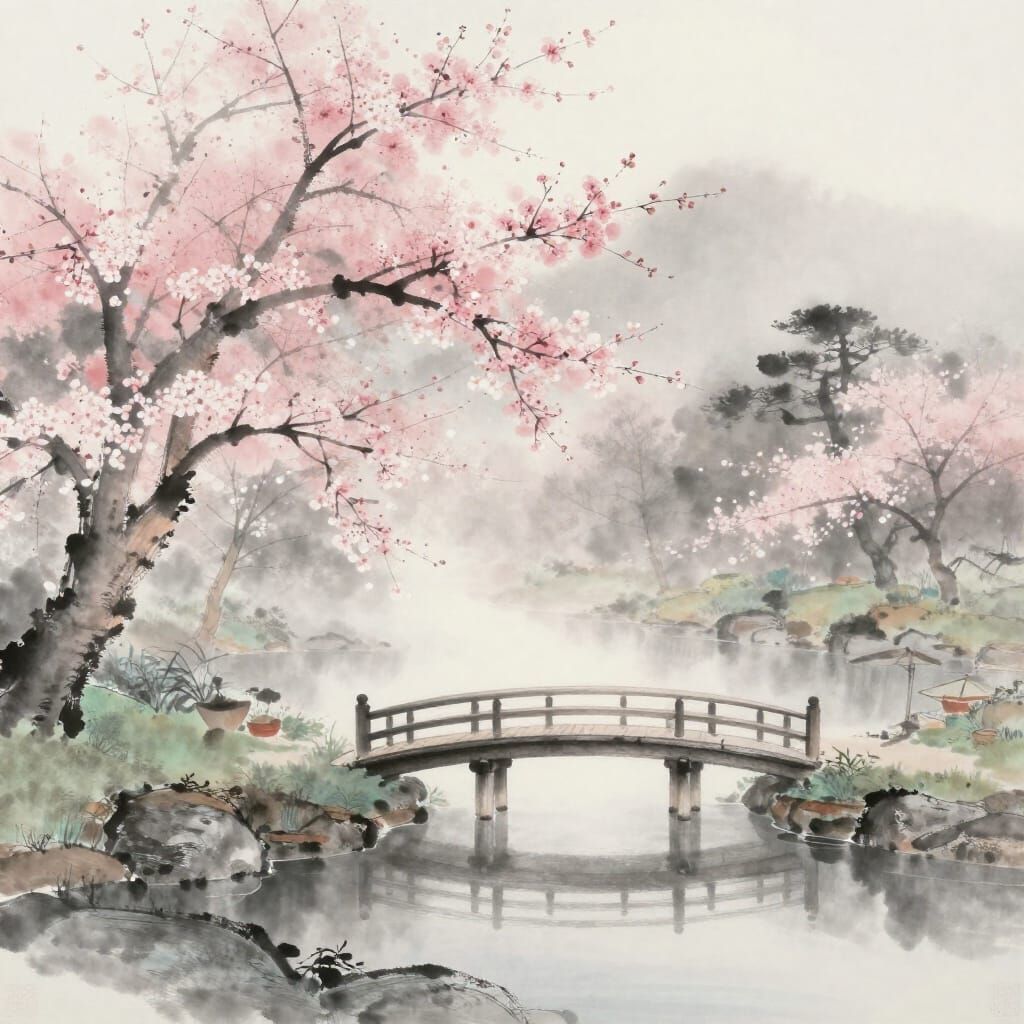 This image showcases a serene Japanese garden shrouded in morning fog, with soft light on cherry blossoms and a tranquil pond. Rendered in a minimalist ink wash style.