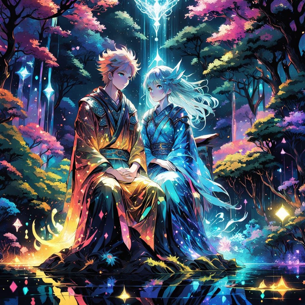This vibrant manga illustration features two mythical beauties in ancient Greek robes, surrounded by a neon-hued fantasy landscape with intricate details and magical aura. Delicate paint textures and complex patterns create a dreamlike atmosphere, with holographic colors and sparkling light points castin...