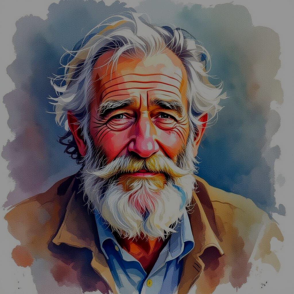 This image shows a bearded old man rendered in a loose, expressive watercolor style. The artwork captures the subject's character with vibrant colors and fluid brushstrokes.