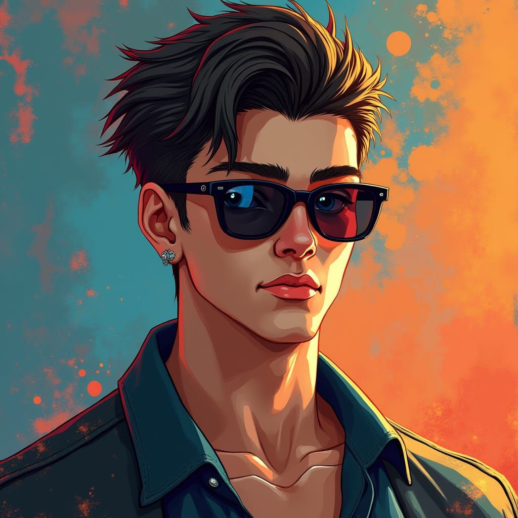 This image features a young, athletic male with chiseled abs and a striking face, illuminated by warm golden light. Inspired by concept art, it showcases vibrant colors and nuanced textures, blending a dynamic pose with a colorful background.