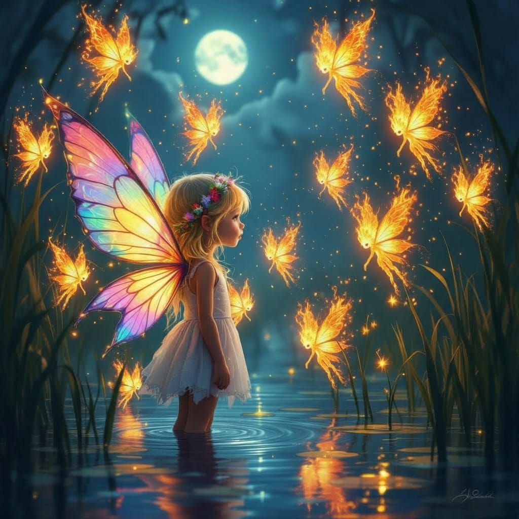 This image shows a blonde girl with fairy wings in a misty swamp, surrounded by glowing plants, moonlight, and tiny fire fairies.