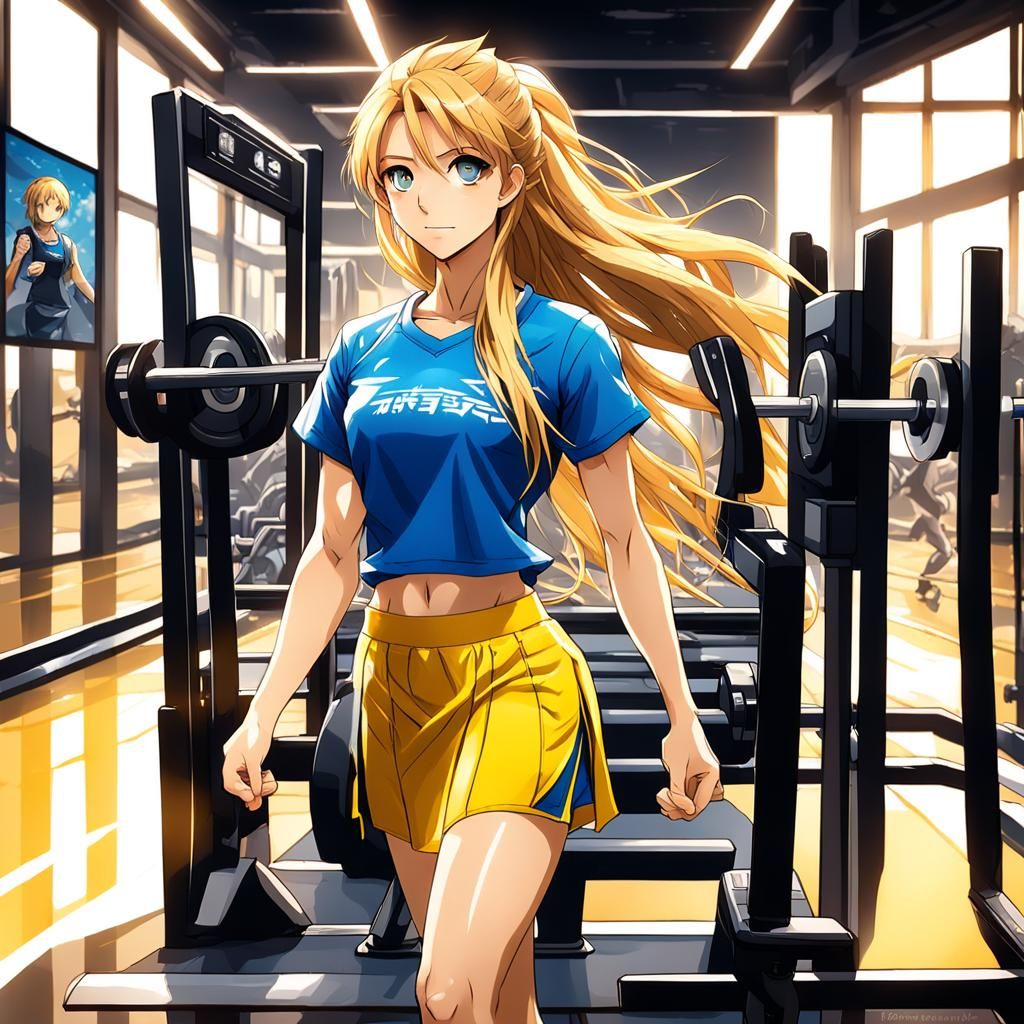 This image shows a beautiful, fit young woman with long hair at the gym. The artwork features dynamic lighting, intricate details and a color palette of purple and yellow, in an anime art style.