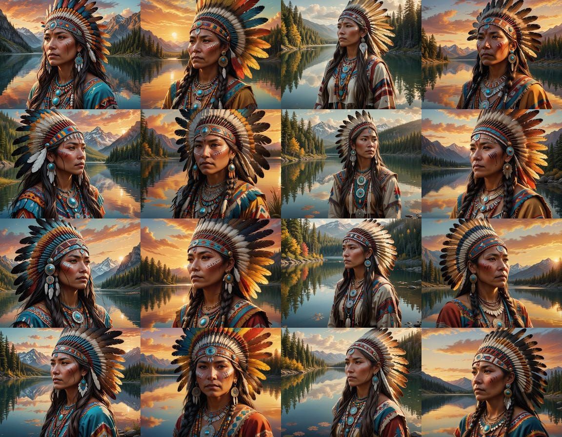 A stunning image of a Native American woman in traditional attire, surrounded by a serene lake and a dramatic mountain backdrop, with a vibrant headdress and colorful jewelry that reflects the natural beauty around her.