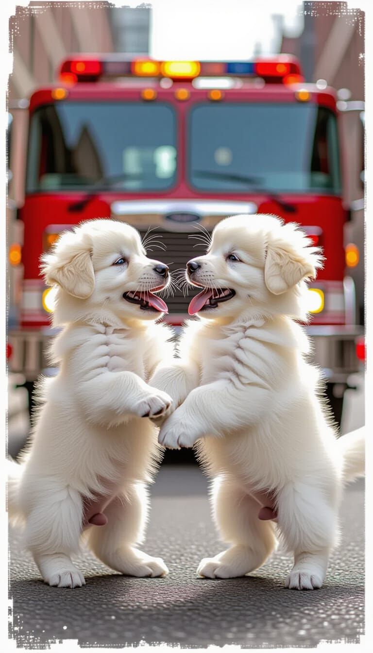 This image shows two fluffy white puppies playing together. The scene is set against a vibrant red backdrop, with cinematic lighting and rich textures, creating a heartwarming and realistic atmosphere.