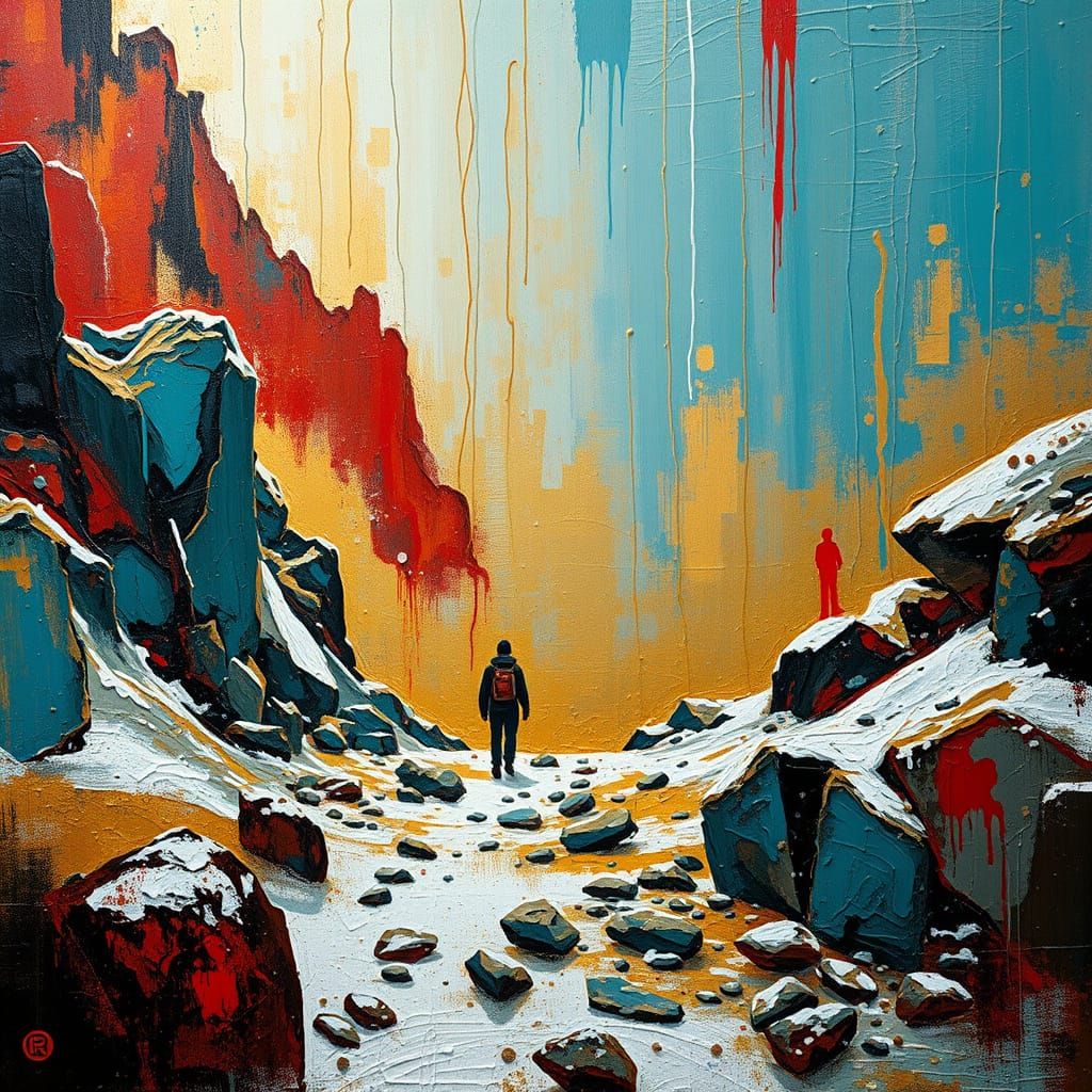 A vibrant impasto painting of a snowy landscape reminiscent of Narnia. The artwork features expressive brushstrokes, a rich color palette of teal, red, and gold, and a textured, atmospheric scene.