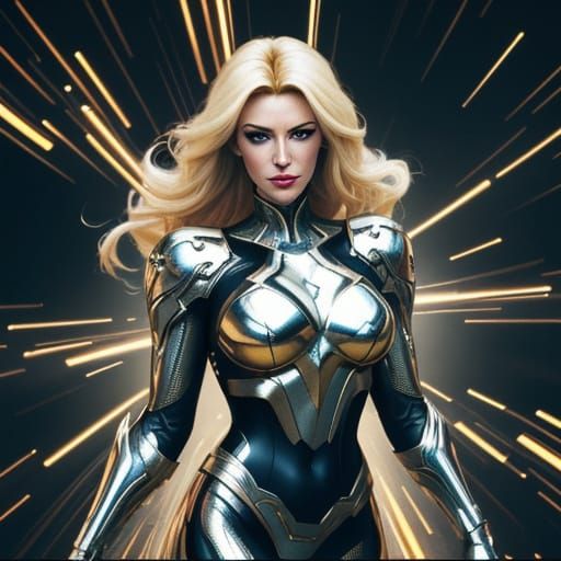 This image features a blonde pin-up woman with striking eye contact, rendered in an impressionistic style with metallic accents and swirling energy trails.