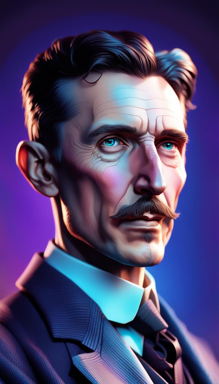 A photorealistic portrait of Nikola Tesla looking directly at the camera. The image showcases detailed skin texture and dramatic lighting, set against a colorful gradient background. The artwork emphasizes vivid, lifelike colors.