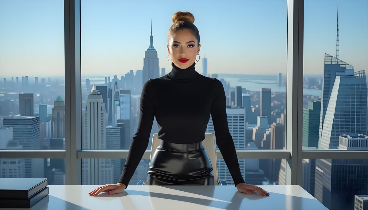 This image shows a Latina secretary in a modern office with a city view. She is dressed professionally in black with red lipstick, styled as a high-resolution photograph.