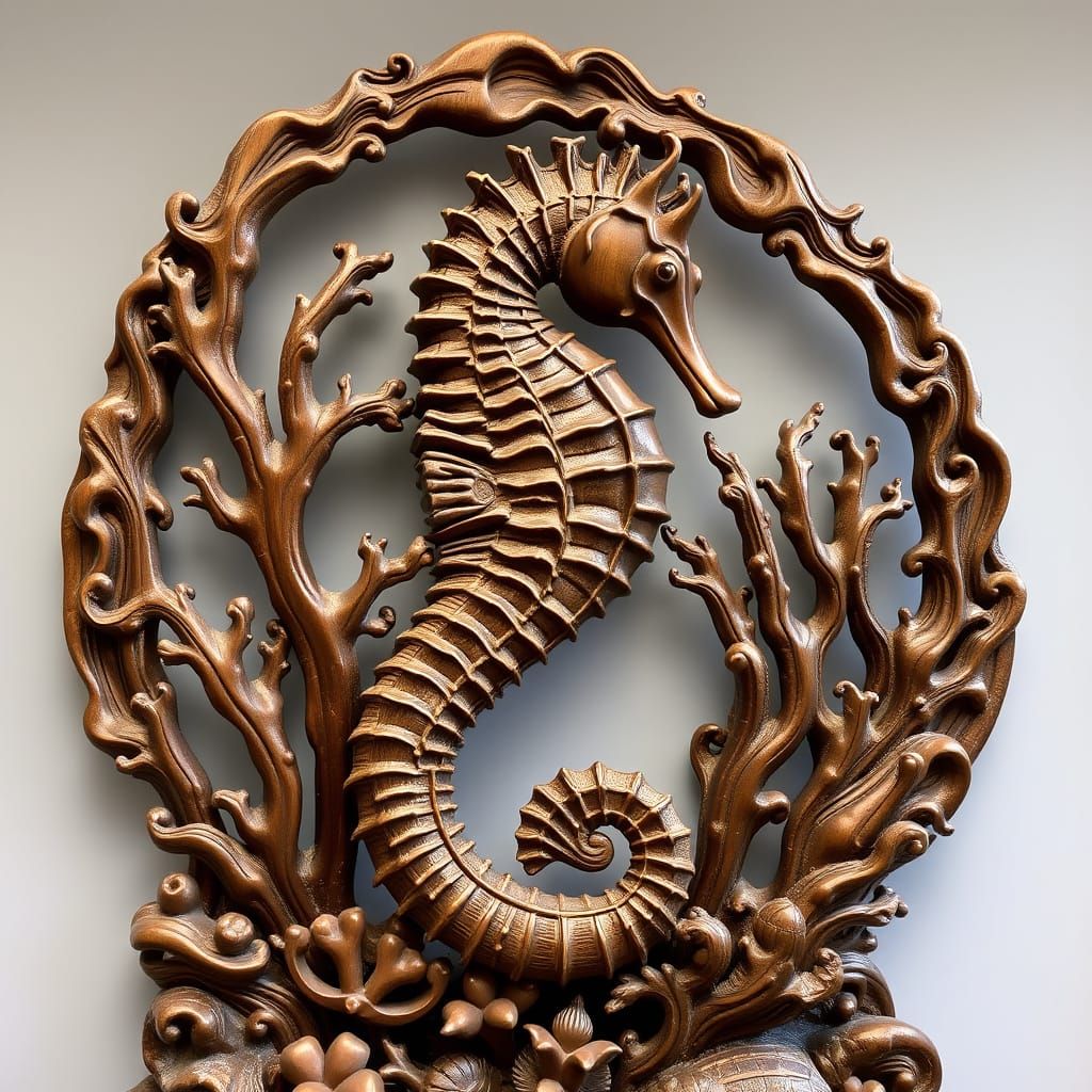 This image shows an elaborate wooden sculpture of a seahorse in a coral reef. The carving is highly detailed and ornate, capturing the natural beauty of marine life.