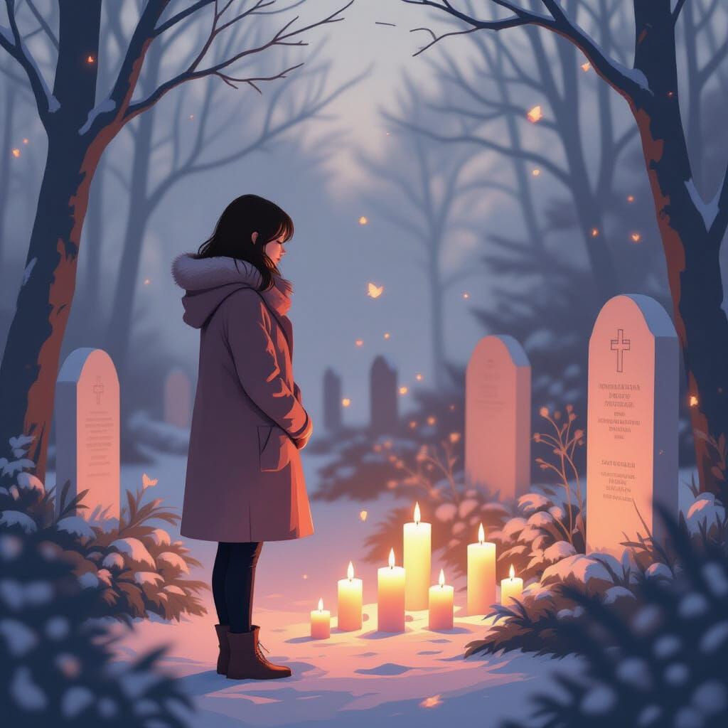 This image shows a memorial bathed in soft pink candlelight. A woman in a coat stands in gentle shadows, creating a serene and respectful scene with delicate lines and whimsical textures.