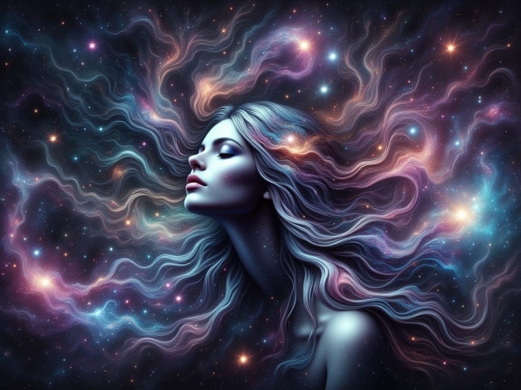 This image shows a celestial woman with galactic eyes and flowing cosmic hair, suspended amidst nebulae and starlight. The artwork blends surrealism with glitch art, featuring vibrant colors and ethereal textures to create a sense of cosmic introspection.