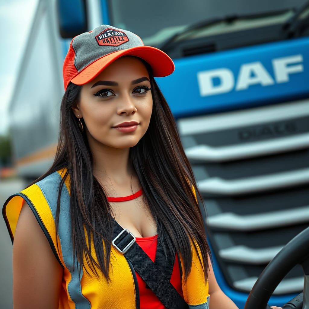 This image shows a female truck driver with long black hair standing next to a DAF truck. She is wearing a red tank top and high vis clothing.